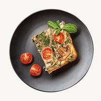 *Složení: 1 vejce, 1/2 rajčete, 1/4 světlé kuličky mozzarelly (30 g), hrst špenátu, 1/2 stroužku česneku, 1 lžíce olivového oleje.